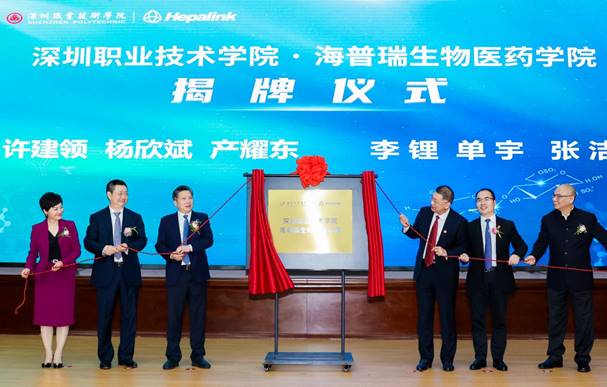 10月26日,深圳首个生物医药特色产业学院——深圳职业技术学院·海普瑞生物医药学院签约揭牌仪式暨海普瑞生物医药学院首届高峰论坛在学校留仙洞校区同德楼1号会议室举行。深圳市人民政府副秘书长、一级巡视员产耀东,深圳市市场监督管理局药品处副处长张天,深圳市科技创新委员会生物科技处副处长王绍文,海普瑞药业集团董事长李锂,副总裁单宇、张洁,深圳技术大学药学院院长贺震旦,深圳市药师协会秘书长陆喜宇,深圳市生命科学与生物技术协会执行秘书长王艳梅,学校党委书记杨欣斌、校长许建领出席。仪式由副校长温希东主持。