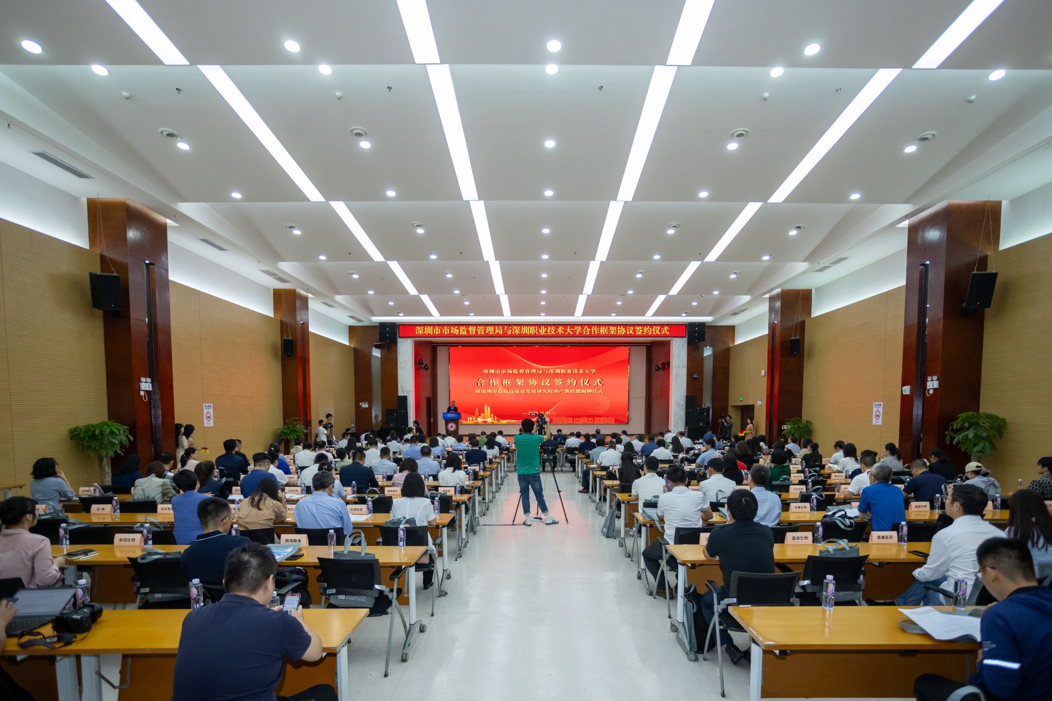 许建领在致辞中指出,党的二十大报告提出要推进职普融通、产教融合、科教融汇。产教融合是实现教育链、产业链、供应链、人才链与价值链有机衔接的重要举措。本次与深圳市市场监督管理局签署合作框架协议,联合成立深圳市食品高质量发展研究院,同时与行业领军企业、技术机构、行业协会共建深圳市食品行业产教联盟和深圳市生物医药产教联盟,在人才培养、应用研发和社会服务等方面开展战略合作,是探索产教融合新模式的生动实践。深职大将在深圳市市场监督管理局的大力支持下,在政、校、企、行各方的共同努力下,一定能够形成更加紧密的产教共同体,集聚更多优势资源,取得更多实质成果,将深圳市食品高质量发展研究院以及两大产教联盟打造成为国内职业教育“政校行企”合作的典范,为推进新时代食药领域产教融合、校企合作树立标杆,为我市食品和生物医药产业高质量发展贡献力量。