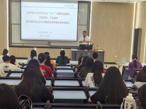 为深学笃行习近平总书记“七一”重要讲话精神,9月29日,食药学院党总支书记、院长刘冬在德业楼为21级新生以及20级学生干部讲授“思政第一课”。受疫情影响,本次思政课采用线上线下相结合的方式,除新生代表以及学生干部外,其他同学通过腾讯会议同步观看此次思政课。