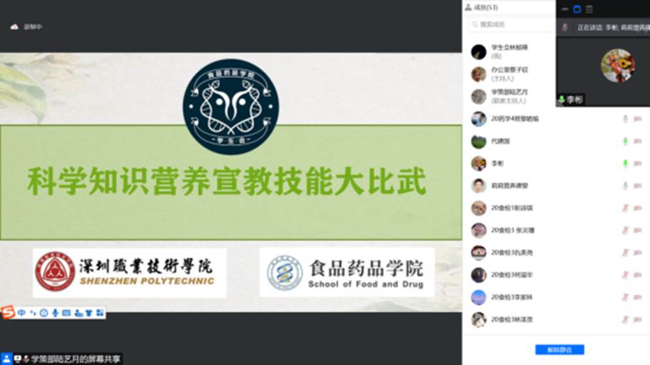 3月23日,为充分发挥学院专业特色,食药学院(博达书院)利用腾讯会议线上举行第一届“能工巧匠”营养宣教技能大比武。本次比赛邀请到学院代建国、李彬、任莉莉老师担任活动评委。根据比赛规则,需以个人或组合团队进行报名参赛,要求每组选手在5分钟内向观众展示健康养生营养方面的见解,一共有10组选手进入最后决赛。选手们经过比赛前的精心准备,将健康养生领域的独到见解通过精美的PPT及有趣的演讲形式传递给观众,使线上观众了解了很多平时没有关注到健康养生的保健知识。最后,比赛评委们除对选手的表现做精彩点评外,还就健康保健养生领域的最新研究前沿跟选手及观众进行了分享,让本次比赛的意义得到了进一步升华,使食药学院学生对食品营养、健康保健等领域产生了更加浓厚的兴趣。(食药学院 刘根柱)