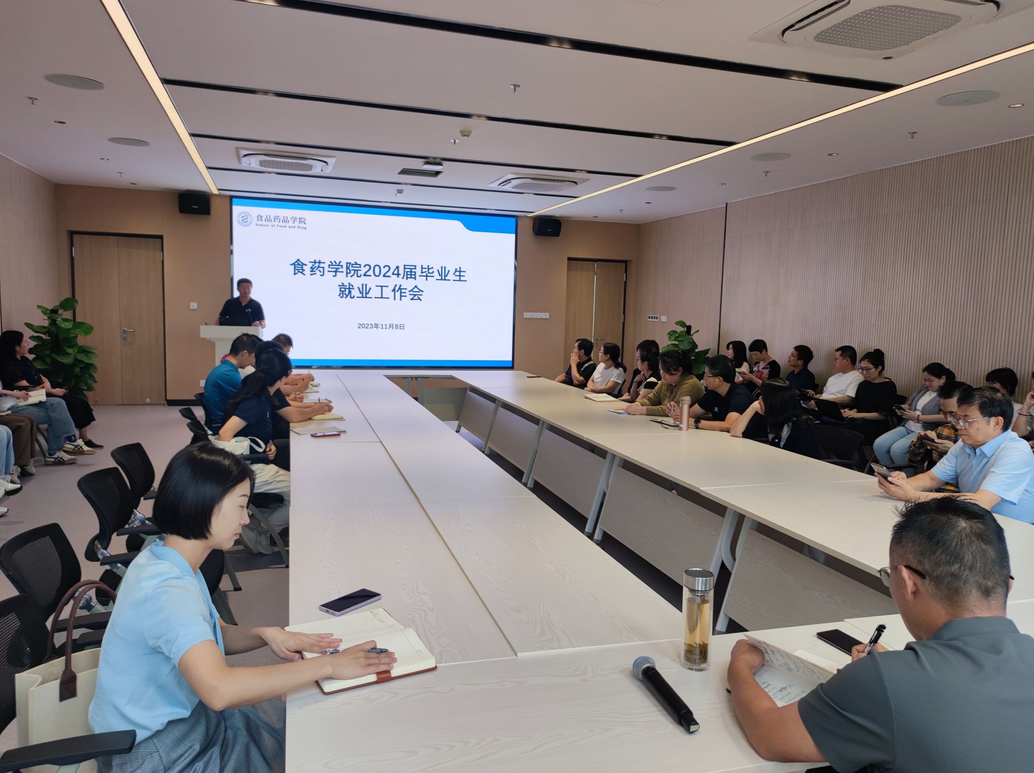 11月8日,食药学院在格物园E座召开2024届毕业生就业工作会议,参加会议的有全体院领导,专任教师及全体辅导员,会议由党总支副书记段杰鑫主持。会议上,段杰鑫介绍2024届毕业生就业工作相关情况,强化本届毕业生专任教师、班主任、辅导员个人职责,随后,2023届就业工作优秀教师代表杨剑老师做经验分享,2024届毕业生班主任代表王金林老师做表态发言。最后,学院党总支书记、院长刘冬就毕业生高质量就业作了总结发言,会议圆满结束。(食药学院 刘根柱)