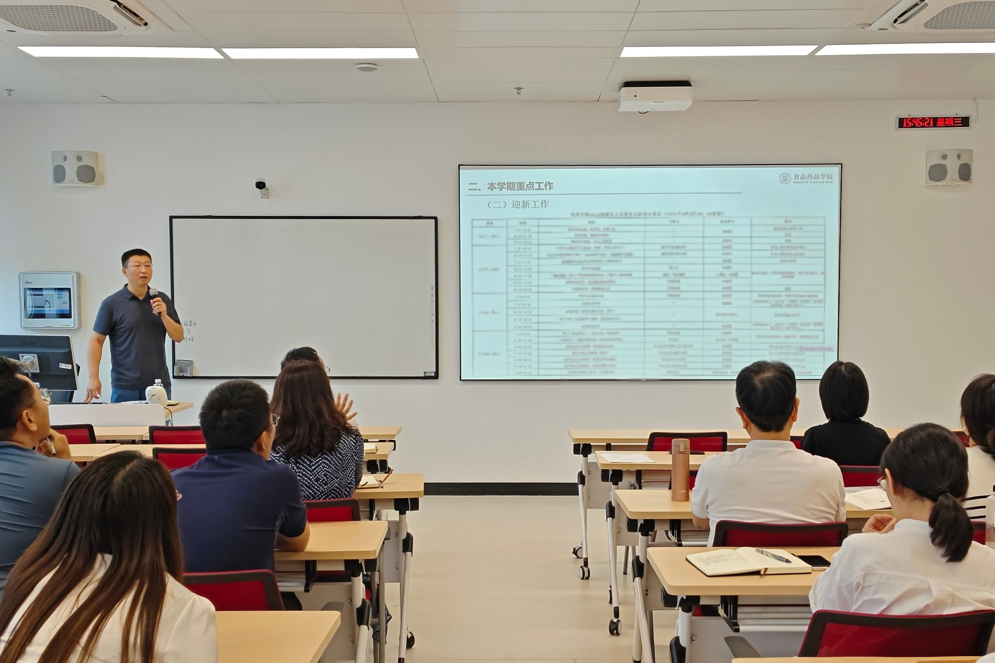 随后,新生辅导员康清越、李天航就迎新工作的实施细节进行了详细说明,并与各专业主任和新生班主任交流了新生报到流程、班级建设、心理健康教育、反诈安全教育、新生早读规划等方面的具体工作。